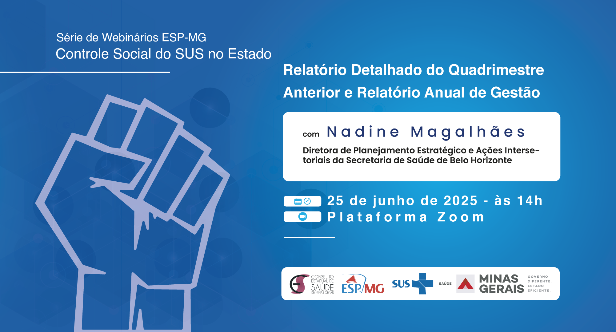 Na próxima quarta-feira, 25 de junho, das 14h às 17h, será realizada a quarta edição de 2025 da série de Webinários “Controle Social do SUS no estado”. A atividade é promovida pela Escola de Saúde Pública de Minas Gerais (ESP-MG), em parceria com o Conselho Estadual de Saúde de Minas Gerais (CES-MG). O evento é online, gratuito e aberto a qualquer pessoa interessada no tema.